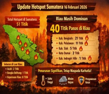 Karhutla Melandai? Hotspot Sumatera Turun, Tapi Riau Masih Dominan Data terbaru BMKG Pekanbaru mencatat penurunan signifikan jumlah hotspot di Sumatera per 16 Februari 2026 menjadi 51 titik. Riau masih menyumbang 40 titik, terbanyak di Bengkalis dan Pelalawan.