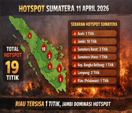 Riau Nyaris Nol Hotspot, Ini Peta Terbaru Titik Panas Sumatera Hotspot Sumatera turun drastis menjadi 19 titik pada 11 April 2026. BMKG mencatat Riau tersisa satu titik di Pelalawan, sementara Jambi masih mendominasi sebaran titik panas.
