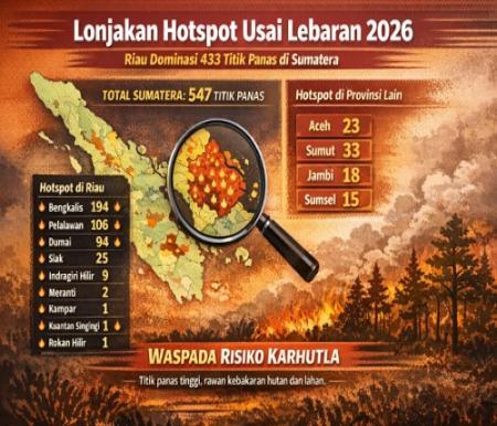 Lonjakan Hotspot Usai Lebaran 2026, Riau Dominasi 433 Titik Panas di Sumatera Lonjakan hotspot di Riau pasca Lebaran 2026 capai 433 titik, mendominasi Sumatera. BMKG ingatkan potensi karhutla meningkat.